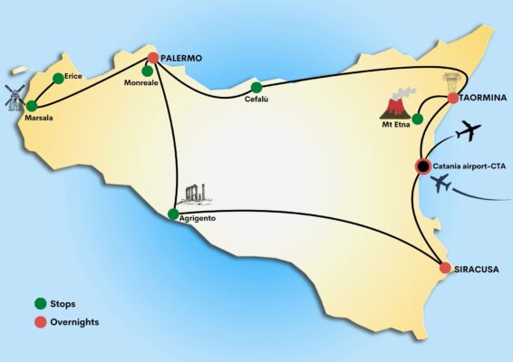 Taormina (2 nights) Palermo (3 nights) Siracusa (2 nights)